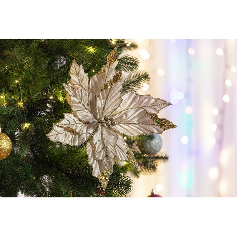 Description: Poinsettia with Gold Glitter Veins and Edges, 4 Colours: Champagne, Gold, Blush Pink, Red, Product Dimensions: 6 x 10 x 37cm