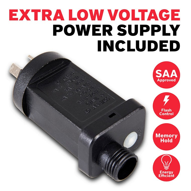 Description: 400 Warm White LEDs, 8 Function Memory Controller, Extra Low Voltage, Indoor or Outdoor Use, 1995cm Lit Length