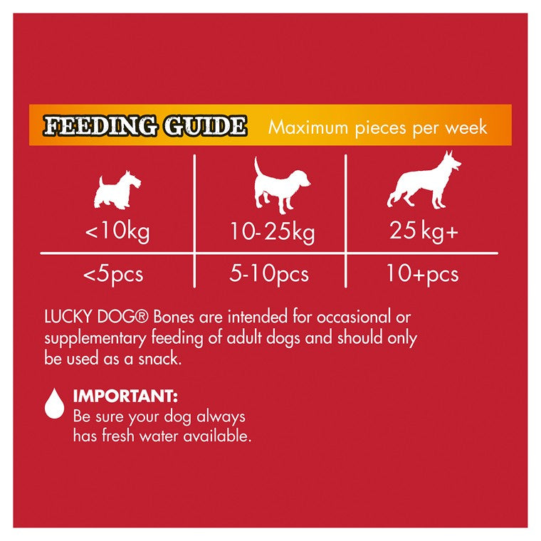 Description: Keep your best mate's tail wagging with PURINA® LUCKY DOG® Adult Bones Original. These oven baked treats are deliciously crunchy and made using wholesome ingredients to give your pet a healthy snack. Ideal to encourage obedience and good behaviour, it offers both an enjoyable taste and oral benefits as it helps reduce tartar for clean, healthy teeth. Proudly made for Aussie dogs, PURINA® LUCKY DOG® have been keeping tails wagging since 1963.